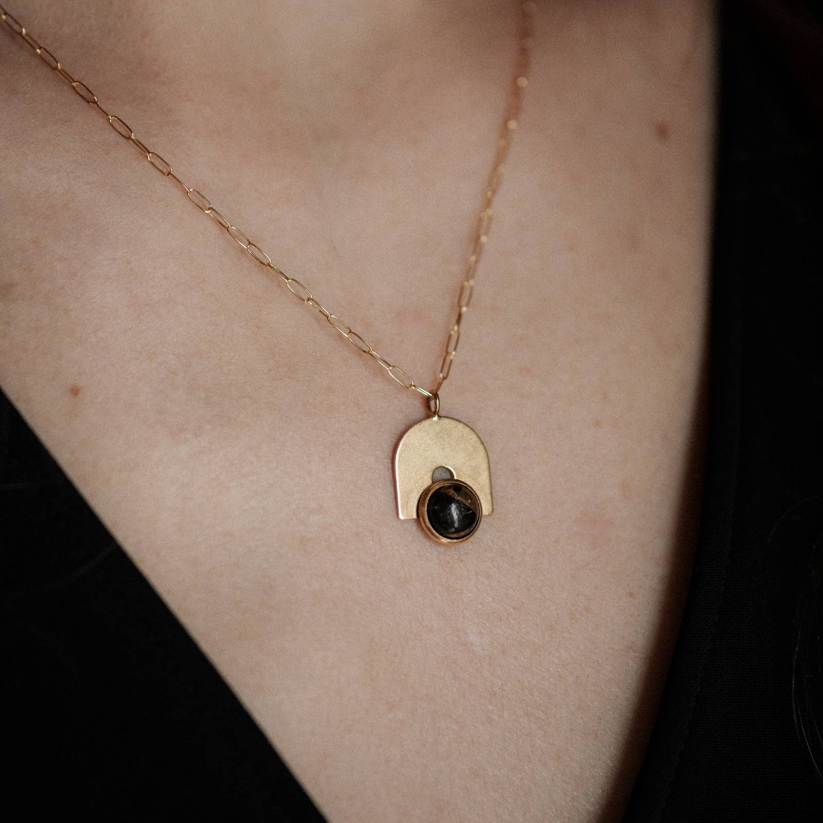 A 24K heavy deposition gold plated 15mm arched piece with an 8mm bezel set copper obsidian stone hangs from an 18" 14K/20 gold filled paperclip chain.