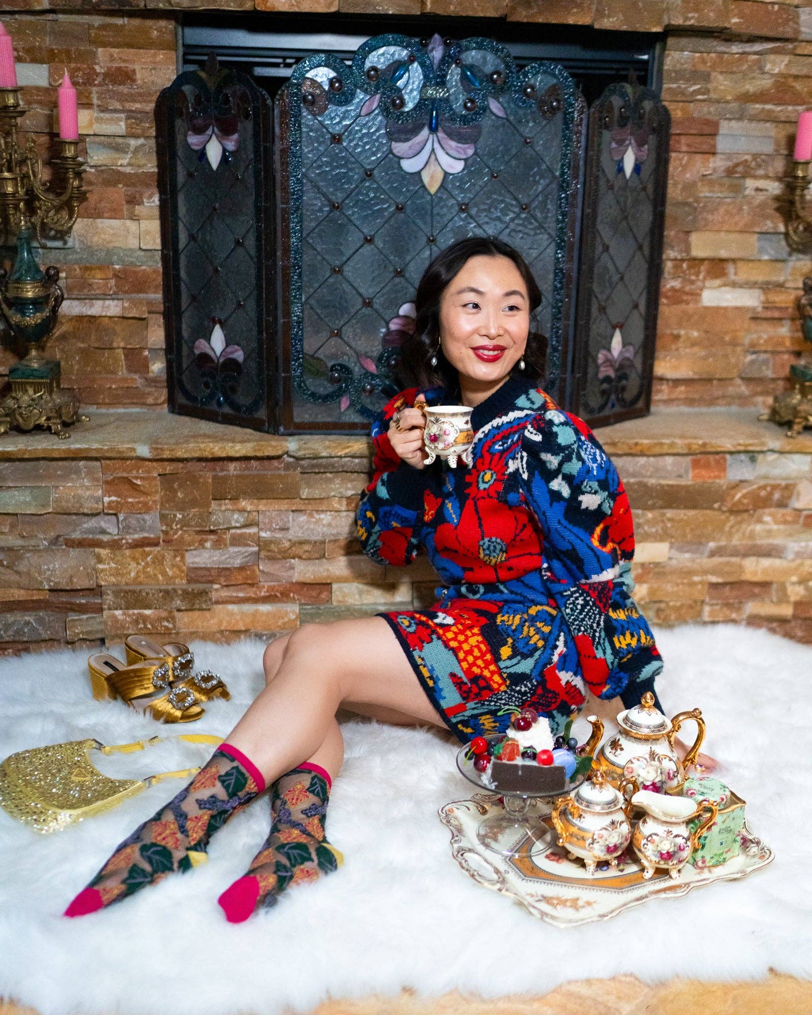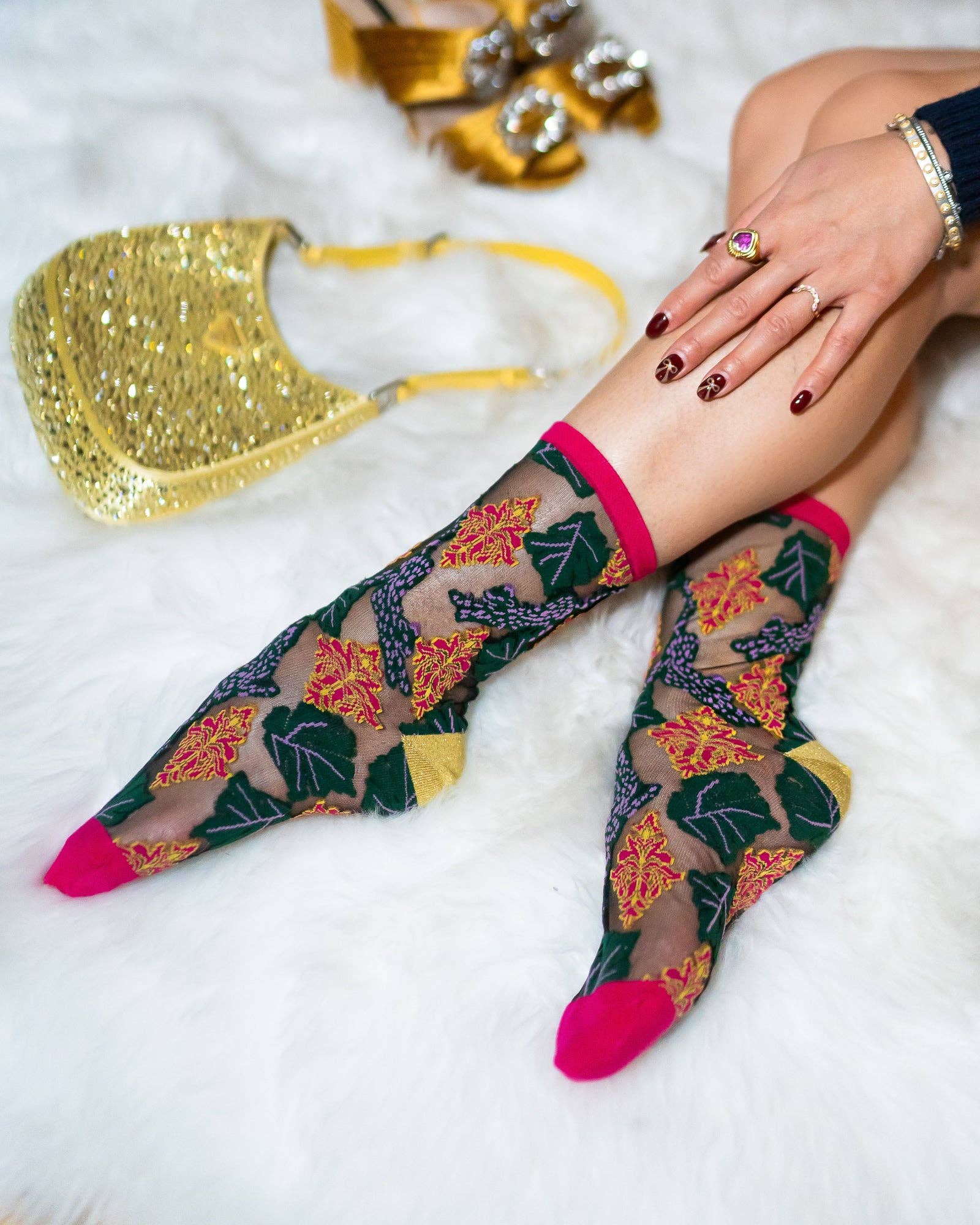 Feel like royalty in our decadent brocade jaguar print black sheer sock. An unexpected color combination of purple and green jaguars make this not your typical sock, while the gold shimmer heel gives your look a fancy touch. Finished against black sheer fabric for a sophisticated vibe!
