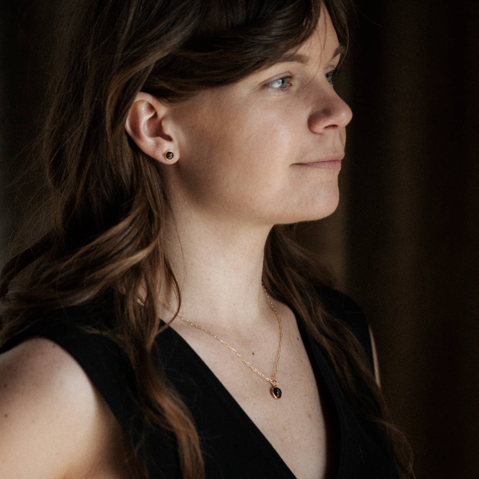 A 24K heavy deposition gold plated 8mm bezel set copper obsidian stone hangs from an 18" 14K/20 gold filled paperclip chain.