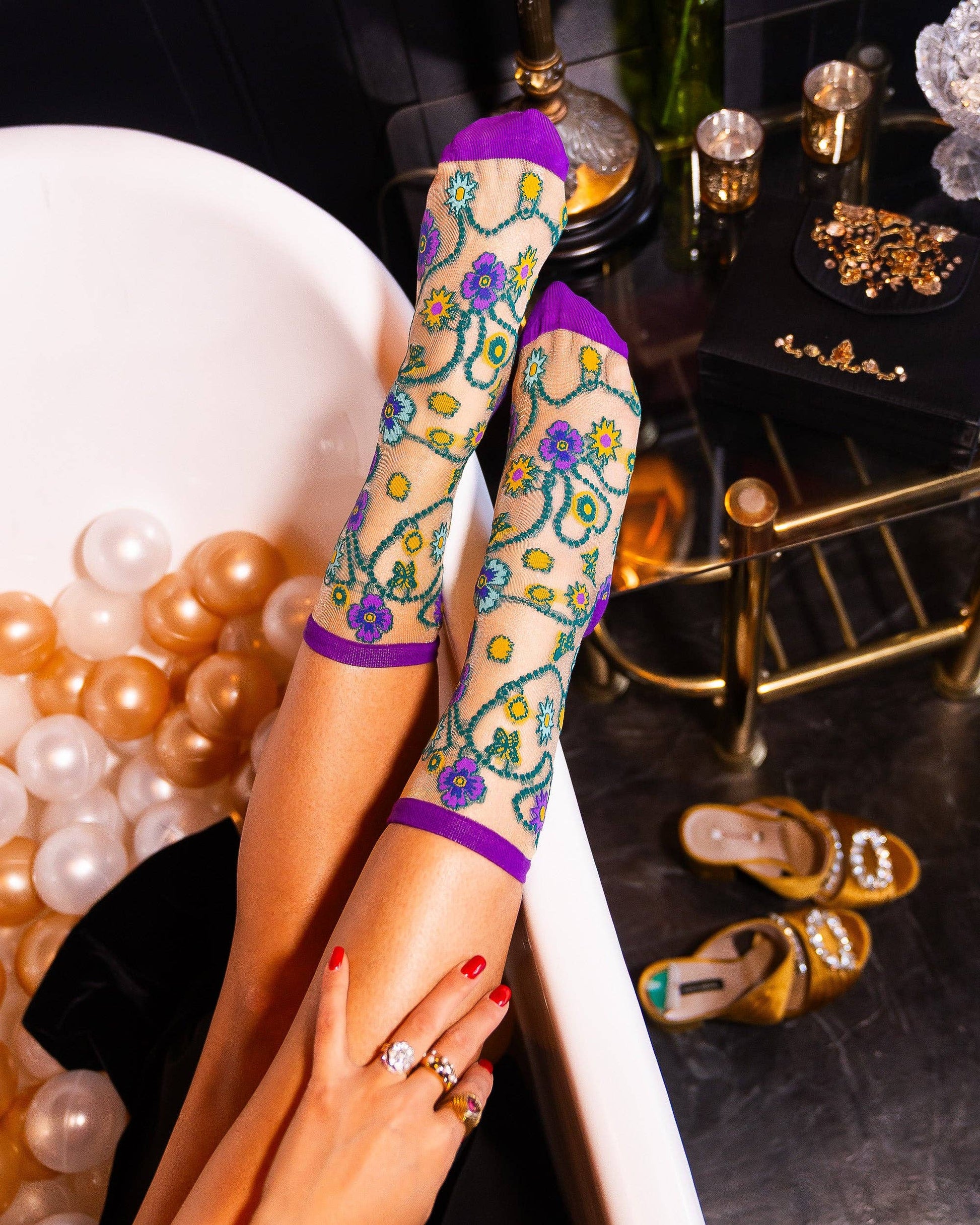 Introducing our first-ever colored shimmer sheer sock – your ultimate statement accessory for every fête, photoshoot, and fashion moment. Crafted with a sheer base that glimmers with a gold metallic thread, this sock features an enchanting garden of jeweled florals in bold purple, teal, and citron, outlined with intricate vine-like embroidery. The vivid purple cuff, heel, and toe pop against the golden shimmer, creating a richly regal effect that’s impossible to ignore Whether you're draped in velvet or soaking in glamour, this sock takes center stage!