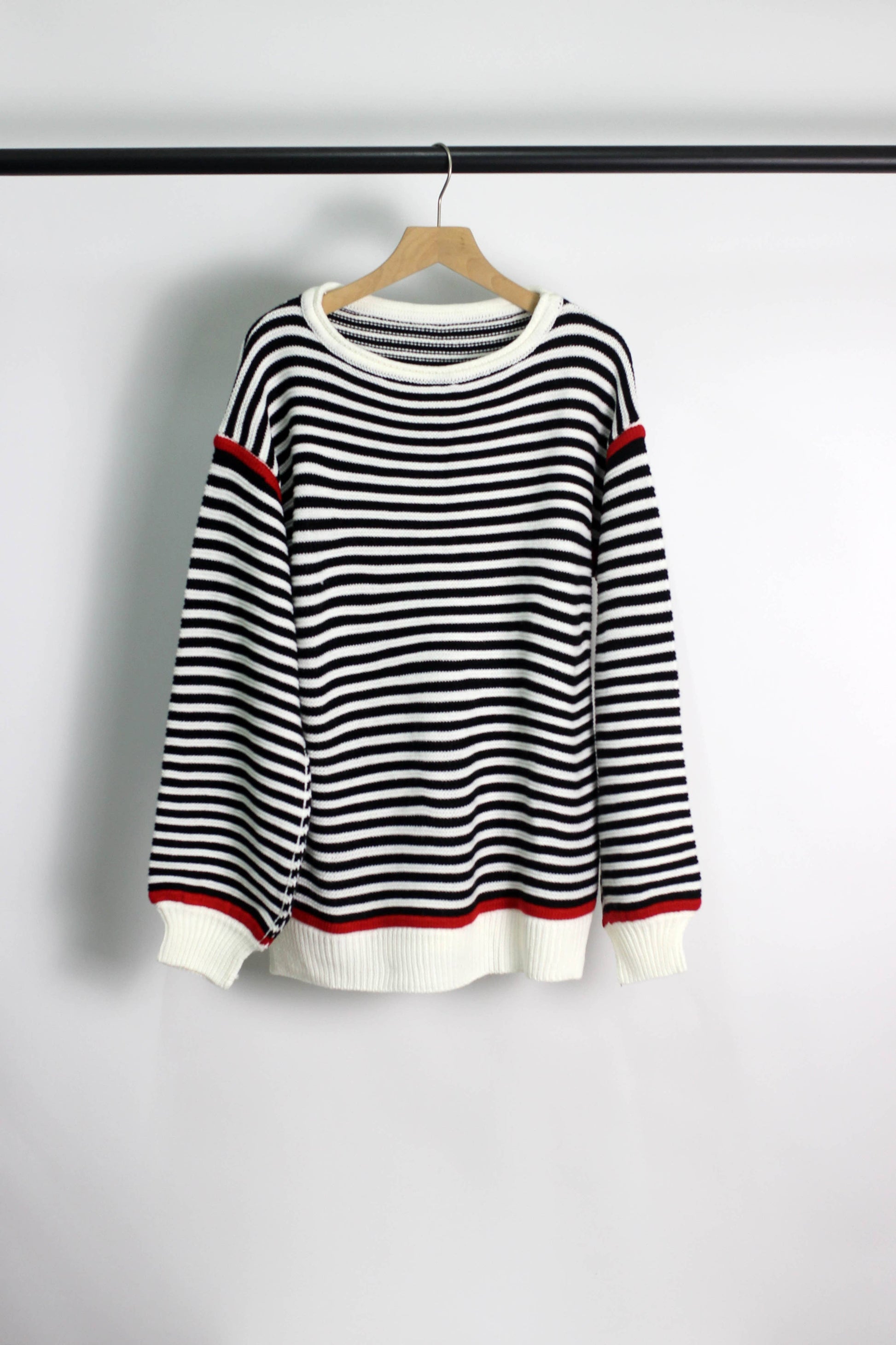 Elevate your everyday style with this women’s classic striped knit sweater. Featuring timeless stripes with chic red trim details on the cuffs and hem, this soft knit pullover combines comfort and elegance. Designed with a round neckline and relaxed fit, it’s perfect for creating a casual chic look. Pair it effortlessly with jeans, skirts, or layer it under a coat for fall and winter fashion. A must-have wardrobe staple that brings a touch of nautical style to your outfit, whether for daily wear, office casual, or a weekend outing.