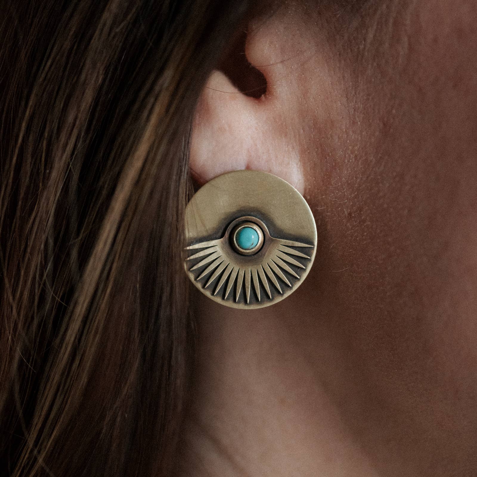 4mm bezel set turquoise pieces sit on 25mm solid brass discs with a brass detail piece and an intentional patina. All connected to sterling silver stud posts.